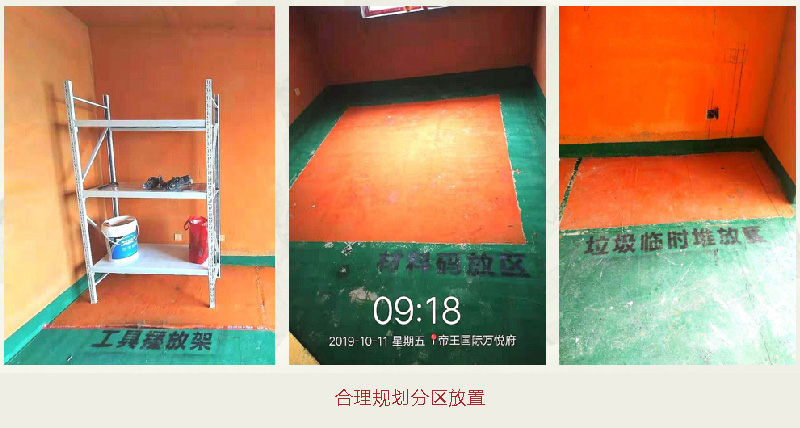 公司根據(jù)工地實(shí)際情況結(jié)合工程現(xiàn)場管理,按照區(qū)域位置定點(diǎn)放置材料、機(jī)具、垃圾,實(shí)現(xiàn)工地統(tǒng)一化、標(biāo)準(zhǔn)化,更科學(xué);